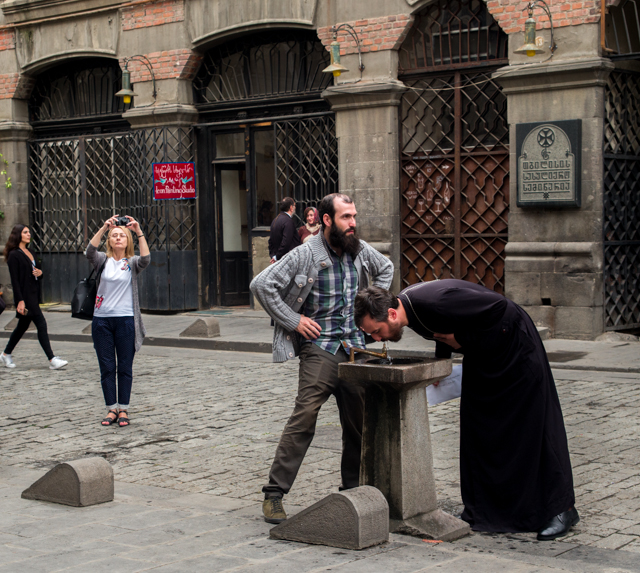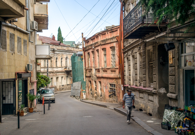 Consulting maps, we learned that the Primize Plaza Hotel is located near the edge of the oldest section of Tbilisi. The main thoroughfares are lined with grand old buildings and a few newer buildings like our hotel. These are then surrounded by neighborhoods with often steep and always narrow streets lined with pre-Soviet buildings that survive in various states of disrepair. Most of the buildings contain occupied apartments, interspersed with an occasional unoccupied building that is clearly beyond saving. The narrow streets are frequently lined with newish automobiles parked along the sides, and they often present an obstacle course for the marshrutky that carry their tightly-packed occupants everywhere through the city. Sidewalks are evidently optional here, and their absence sometimes forces pedestrians to run a slalom course among parked cars and traffic. A statue of Mother Georgia on the mountainside near Narikala Fortress looms over the Old Town. She holds a sword in one hand and a cup of wine in the other. There are also neighborhoods in the city where the apartment buildings are far newer, well maintained and obviously more properous, as we would learn during a long walk on our last day in the country.