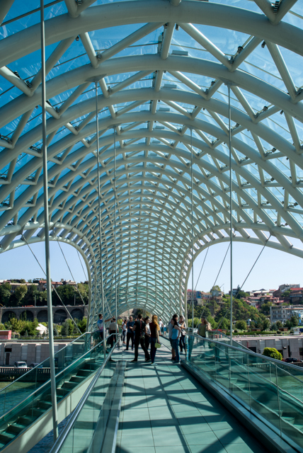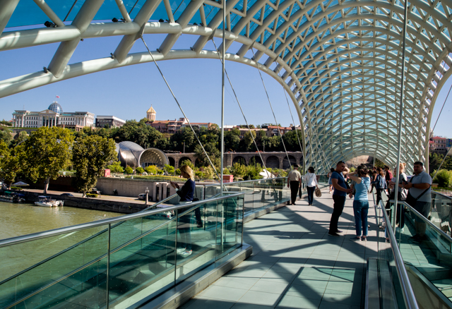While the Meidan Square and Old Town are along west bank of the Mtkvari River, the east bank holds a modern civic zone. Named Rike Park, it is reached by crossing the river on the Peace Bridge. This footbridge itself is a work of art which opened in 2010. It has a white tubular steel frame, covered with nearly transparent greenish panels and from which is hung a wide pedestrian walkway.