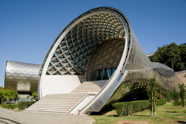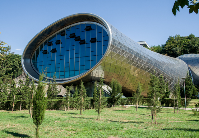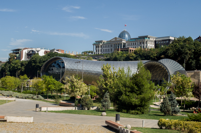 The tower and gold dome of Tsminda Sameba Cathedral and the new Presidential Palace both sit high above the gardens and flower beds of the park. The park also hosts a new very modernist concert hall, formed by a pair of long tubes that extend toward the river frome their point of intersection. The tubes are not circular, and the end of one holds a long, wide staircase that rises to an entrance that sits under the end of the tube which forms an awning there. The second tube ends in a recessed wall of glass windows.