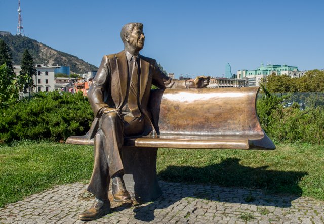 Wandering toward the river from the concert hall I spied a life-sized bronze statue of a figure sitting on a bench. When I got close enough, I immediately recognized the figure to be Ronald Regan, the President of the United States who receives much international credit for the collapse of the Soviet Union and the independence that Georgia and other countries of the Soviet bloc thereby gained. This statue is the second one that I have seen in countries of Eastern Europe that honor a U. S. president, the other being the statue of Bill Clinton that occupies a prominent place in Pristina, the capitol of Kosovo.
