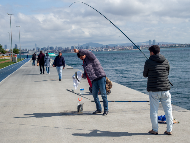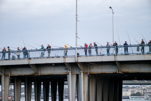 The ferry route passes under several bridges which cross the Golden Horn. All those bridges seem always to be lined with fishermen.