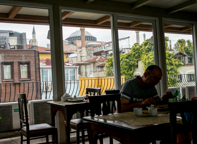 Like the other hotels in the district, the Gul Sultan serves breakfast on the rooftop where the view can be interesting. The breakfast was excellent, and we could see the top of Hagia Sofia rising above other intervening buildings.