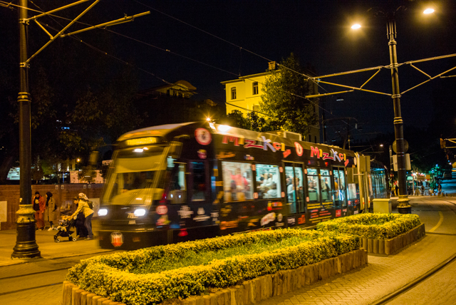 Ataturk Airport in Istanbul has a much better layout than Frankfurt's, but the planes from European cities seemingly all land every day within a single hour, and that makes for an incredible crush of passengers moving very slowly through passport control. We eventually made it through, topped up our Istanbul Kart for public transportation, and boarded the Metro train just as darkness fell. It was the rush hour, and the crowded train took us to a station where we transferred to a crowded tram.