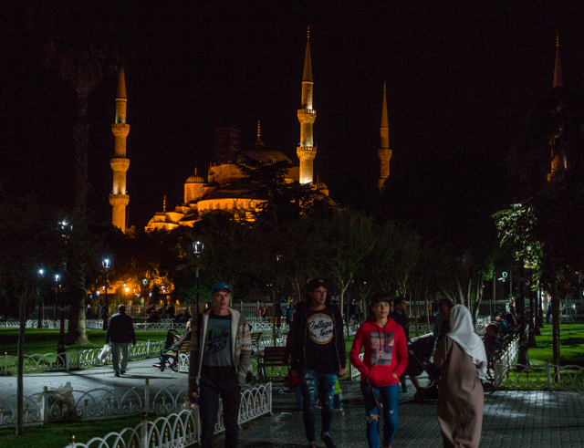 Taking a stroll before a late dinner, we walked after dark uphill to the park which surrounds and spans the distance between the Blue Mosque and the Hagia Sofia.