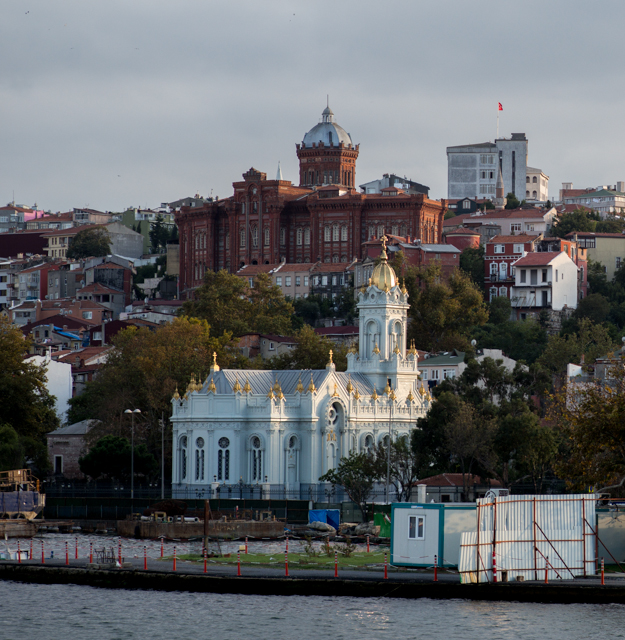 Reaching the Avansaray ferry stop, we gazed across the Golden Horn at the city, as we waited another hour in the park then boarded for the return trip. But rather than leaving the ferry where we originally got on, we chose to ride to then end of the route at Karakoy. Near one of the stops, the late-afternoon sun cast a revealing light onto the architecturally ornate Bulgarian Orthodox Church.
