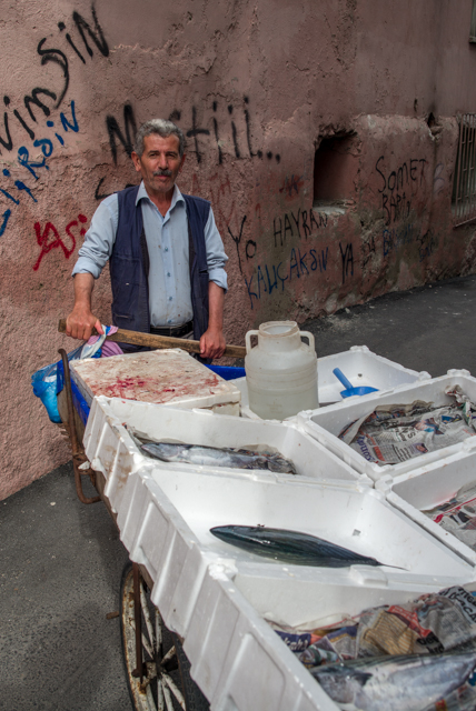 Turkey is still largely a "personal scale" country in contrast to the "corporate scale" of the US. This fish monger was plying his "personal scale" business, hawking fresh fish through the narrow residential streets.