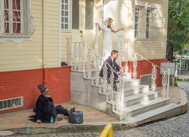 We left the church and walked partway around the outside where we found a wedding party with the bride and groom posing for photos.