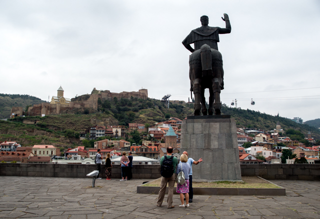 The plaza outside the church contains the equestrian statue of the 5th Century King Vakhtang Gorgasali who built his castle there. Across the river is the Narikala Fortress on a still higher mountain. It originated as a Persian fortress in the 4th Century CE.
