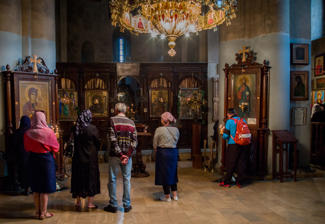 At the time of the photo here, the priest was at the altar behind the iconstasis where only the ordained may go, while the choir led the service. Then the woman at center in the red scarf began to sing/chant in a crystal clear soprano voice that filled the small church and stimulated echoes from the high stone walls and the dome far above her. Finally, a large, bearded priest emerged from the altar space. He was dressed in ornate robes and swung a censor to and fro making its incense-scented smoke drift about in ephemeral white wreathes. He mumbled a few well-rehearsed phrases then retreated again behind the iconostasis, and the service ended.