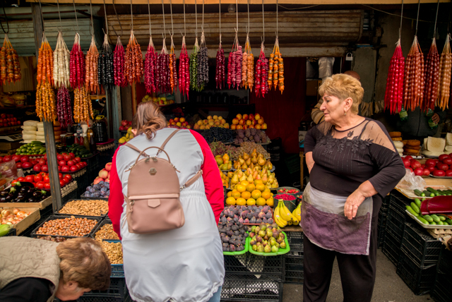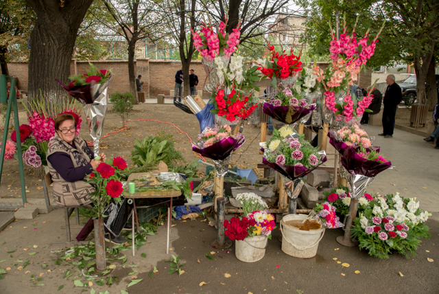 We left the church and climbed the hill out of the river valley, and soon arrived at another busy square where many automobiles circled a central fountain in a steady stream. Continuing further uphill we left the busy public avenues and entered a neighborhood. Soon we encountered a small park at a wide spot in the street. The curb was occupied by several diagonally-parked marshrutky, the ubiquitous vans that serve in Georgia as public transportation on both local and inter-city routes. Many older men were lounging around the park. At the park's edge along the sidewalk a woman had set out many bouquets of flowers flowers to sell.