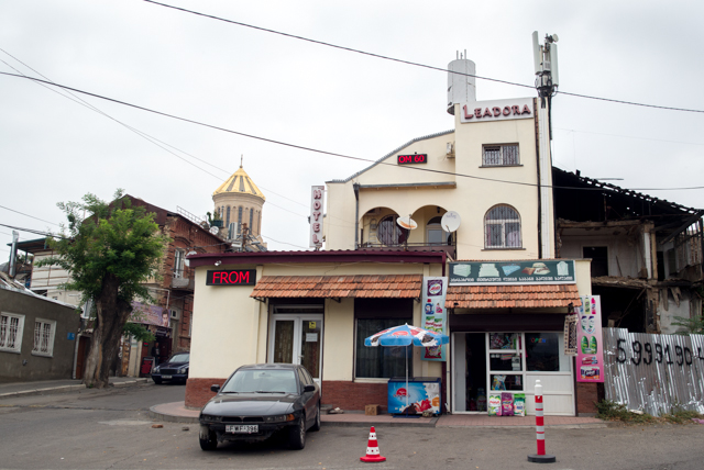 He was right. It was a very long way into central Tbilisi. After perhaps 20 minutes at high speed we entered the city. We had given him the name of the hotel where we had reservations, and he consulted his phone to find where to deliver us. After many twists and turns through city streets, he stopped at a tall, plywood wall. I could see a large newish building over the top of the wall and a construction site across the "street" from it. Undaunted by this unexpected circumstance, I noticed a "doorway" through the wall, and after paying our driver, we walked through the "doorway" and found the very new and comfortable Hotel Pirimze. I have no idea whether I could have succeeded to take a bus into the city from the airport and then to find this place without eventually hiring a taxi.